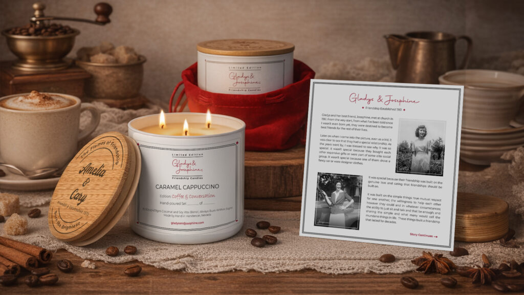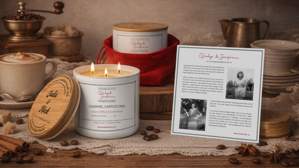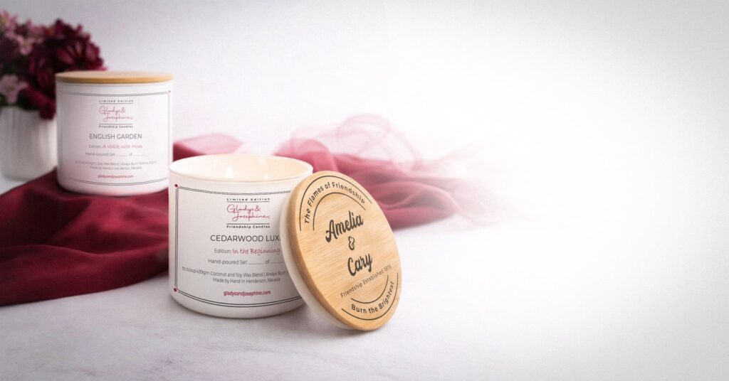 Share the joy of your friendship with matching candles designed to honor your unique bond. Custom engraved with your names and the date your friendship began.  A perfect tribute to the connection you share. That’s what makes owning a Gladys and Josephine candle so special!